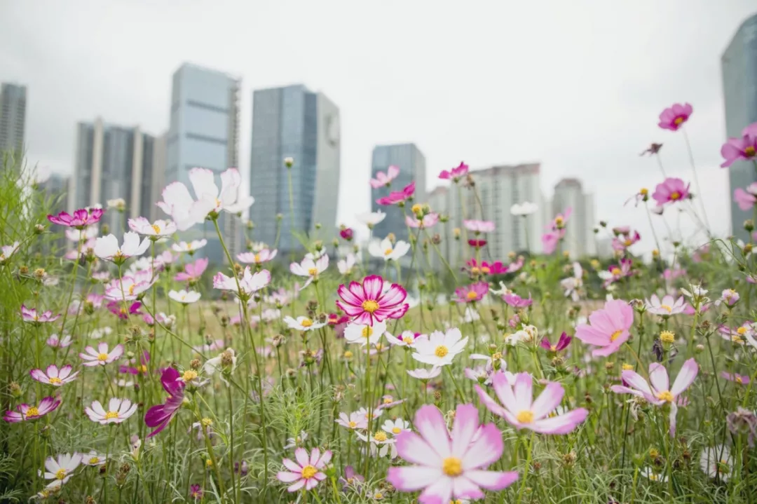 從寶安圖書館步行數(shù)十步,便是一大片浪漫的花海。風(fēng)從不遠(yuǎn)處的海面吹來,那些隨風(fēng)起舞的白色、黃色、紫色、紅色、粉色的小花,就是秋英。