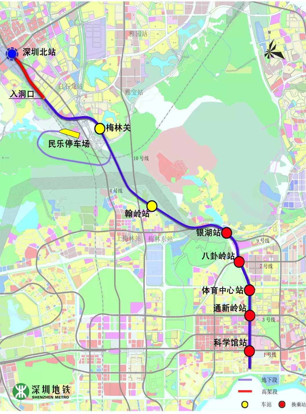 6號(hào)線二期工程線路全長(zhǎng)約11.8km,換乘車站5座,線路從深圳北站預(yù)留高架橋工程引出,途徑龍華、福田、羅湖三區(qū),終止于科學(xué)館站。