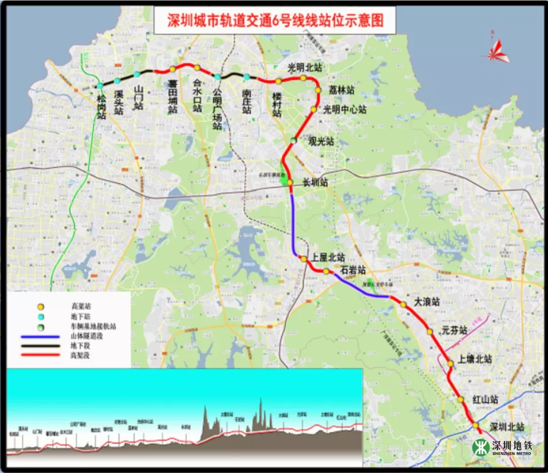深圳地鐵6號(hào)線一期工程全長(zhǎng)約49.4km,其中一期工程長(zhǎng)約37.6km,起自深圳北站綜合交通樞紐,終止于松崗站,設(shè)車站20座(其中地下站5座,高架站15座),與4、5、11、13、15號(hào)線及廣深港客運(yùn)專線綜合換乘。