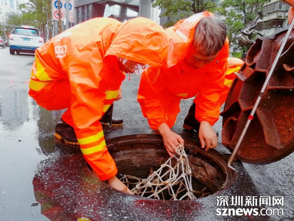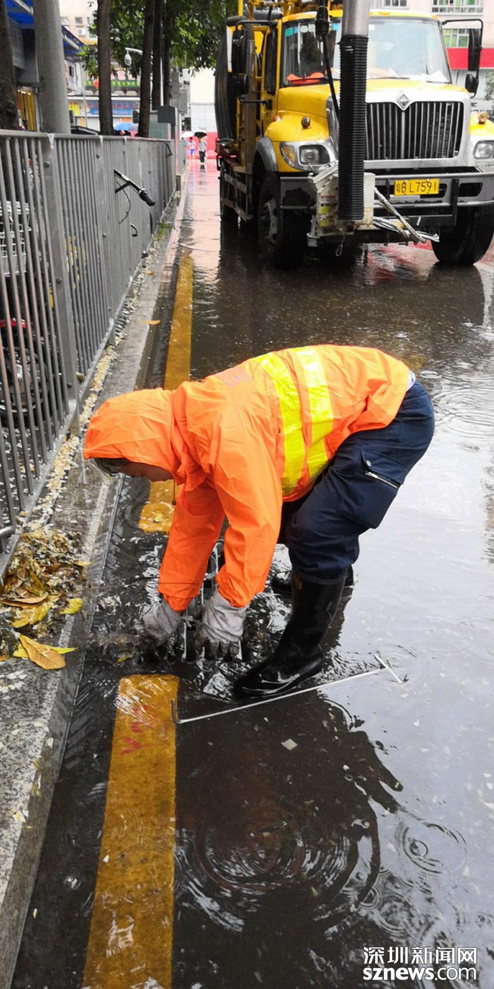 福田區(qū)深南路證券大廈前,工作人員正打開雨水篦子加速排水