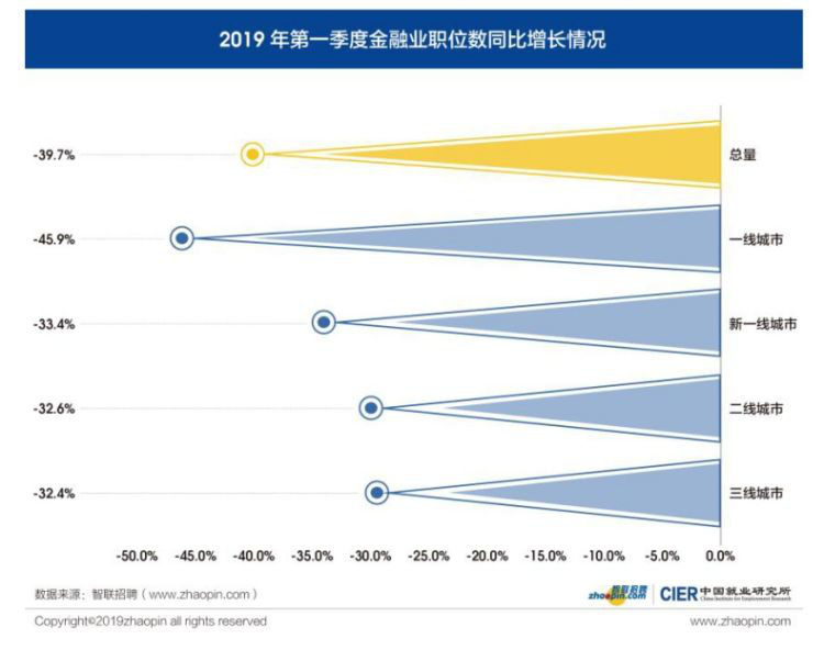 此外,調(diào)研顯示,備受矚目且高薪的金融行業(yè)本季度就業(yè)狀況并未隨著股市的回暖同步好轉(zhuǎn)。根據(jù)智聯(lián)招聘大數(shù)據(jù),金融業(yè)2019年一季度的招聘職位數(shù)降幅在所有行業(yè)中最高,達(dá)39.7%。其中一線城市金融行業(yè)職位數(shù)的降幅最大,為45.9%,新一線、二線和三線城市的降幅均在33%左右。2017年以來,強(qiáng)化監(jiān)管成為金融領(lǐng)域的主基調(diào),在去杠桿、防風(fēng)險的同時,金融行業(yè)發(fā)展速度有所放緩,向市場提供的就業(yè)機(jī)會也整體下降,這在互聯(lián)網(wǎng)金融等新興業(yè)態(tài)主要活躍的一線城市表現(xiàn)更為明顯。