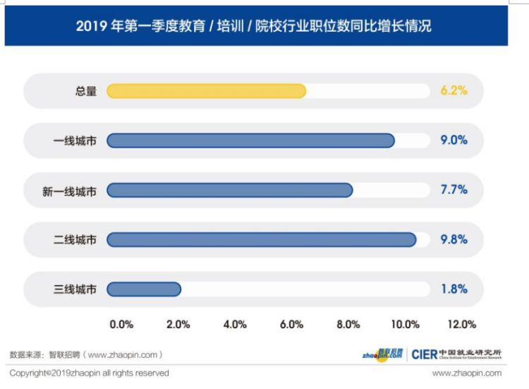 根據(jù)智聯(lián)招聘大數(shù)據(jù),本季度全國招聘職位數(shù)同比下降11.0%,但教育 /培訓(xùn) /院校的招聘需求逆勢上升,該行業(yè)招聘職位數(shù)量最大、貢獻(xiàn)就業(yè)崗位最多。受經(jīng)濟(jì)轉(zhuǎn)型帶來人才需求結(jié)構(gòu)變化、傳統(tǒng)教育無法滿足市場需求、個人學(xué)習(xí)意識增強(qiáng)等綜合因素影響,教育 /培訓(xùn) /院校行業(yè)近年來快速發(fā)展,由于其用工需求量較大,就業(yè)貢獻(xiàn)十分可觀。同時,隨著二三線城市家庭收入的增長和在線教育硬件普及率的提高,教育培訓(xùn)機(jī)構(gòu)的用人需求正逐漸向二三線城市下沉。