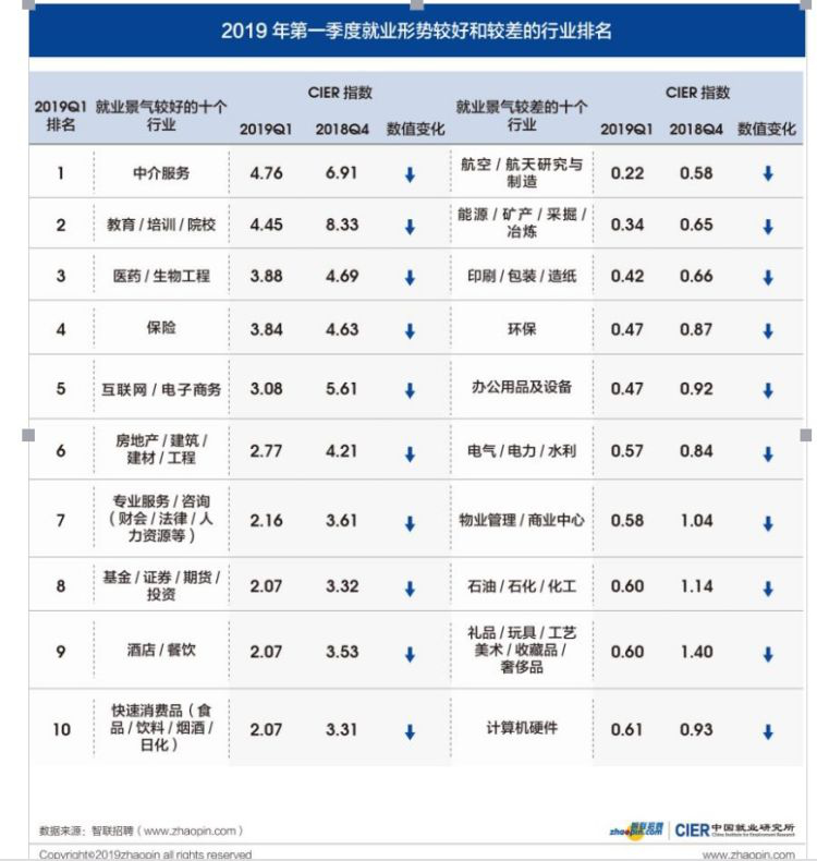 4月20日,智聯(lián)招聘發(fā)布2019年第一季度《中國就業(yè)市場景氣報(bào)告》。報(bào)告顯示,一季度就業(yè)景氣指數(shù)呈季節(jié)性下降,為1.68。本季度,教育 /培訓(xùn) /院校的招聘需求出現(xiàn)逆市上升,而金融業(yè)招聘職位數(shù)降幅在所有行業(yè)中最大。