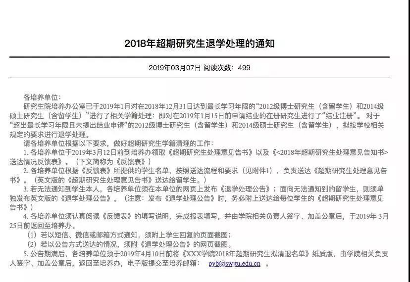 對(duì)于"超出最長學(xué)習(xí)年限且未提出結(jié)業(yè)申請"的2012級(jí)博士研究生(含留學(xué)生)和2014級(jí)碩士研究生(含留學(xué)生),擬按學(xué)校相關(guān)規(guī)定的要求進(jìn)行退學(xué)處理。