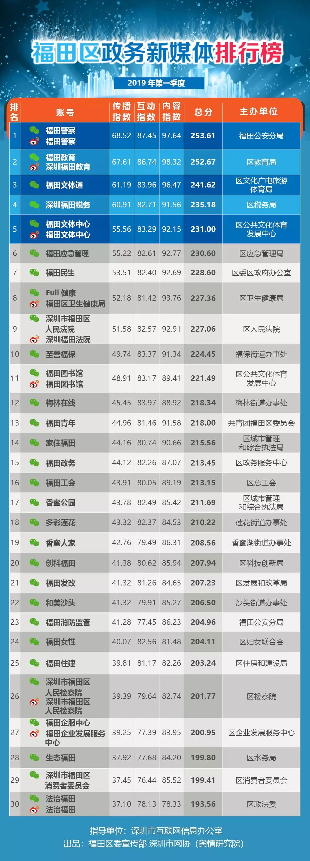 榜單根據(jù)新媒體屬性以及政務(wù)信息公開工作特點,將福田區(qū)各政務(wù)部門及公營單位開設(shè)的新媒體賬號,按照傳播指數(shù)(100分)、內(nèi)容指數(shù)(100分)、服務(wù)指數(shù)(100分)三項指標(biāo)進行綜合評價,計分排名,形成榜單。
