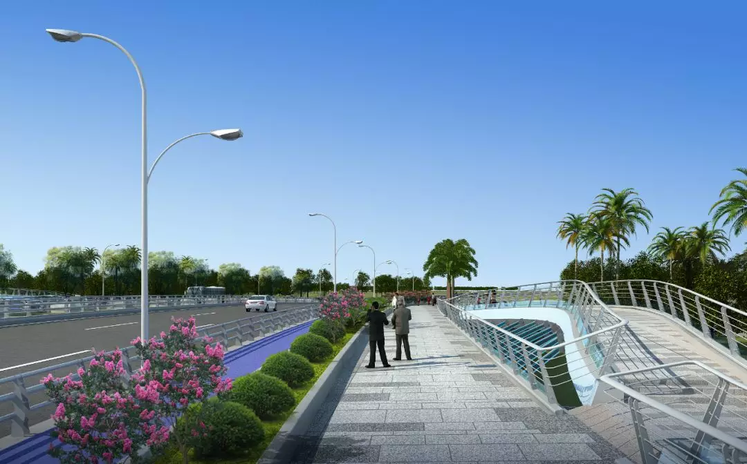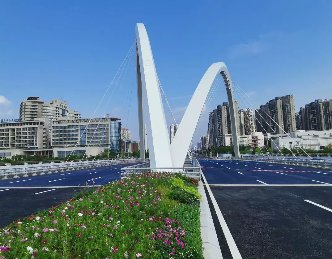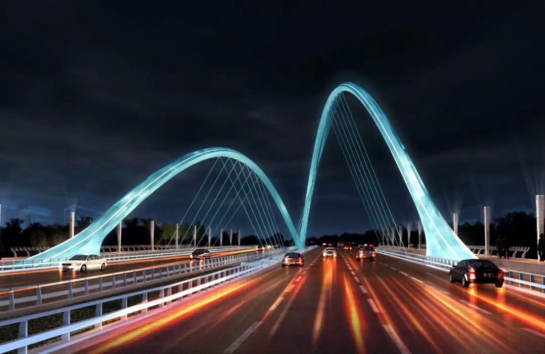 11號(hào)景觀橋以“融合”為主題,將流暢的線條融入景觀橋梁中,兩幅高低拱的線條無(wú)限延伸,猶如行云流水般瀟灑寫意,一氣呵成;同時(shí),匯聚為一體的主拱又形成了“門”的形象符號(hào),迎接著八方來(lái)客。