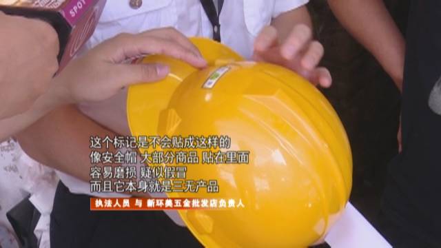 在新環(huán)美五金批發(fā)店,銷售的所有安全帽,除了寫有一個“安鑒”的字樣外,就再沒有任何標識,而且“安鑒”標志粘貼也不符合規(guī)范,明顯也屬于三無產(chǎn)品。