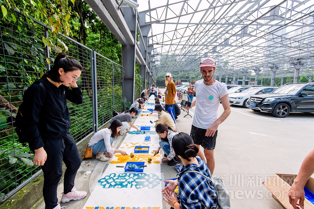 志愿者在協(xié)助創(chuàng)作《安全地帶》花磚涂鴉作品(主辦方供圖)