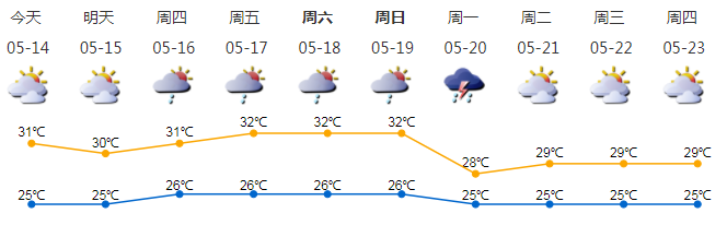 我市多云,早晚有輕霧;氣溫25-31℃;偏南風(fēng)2-3級;相對濕度55%-95%