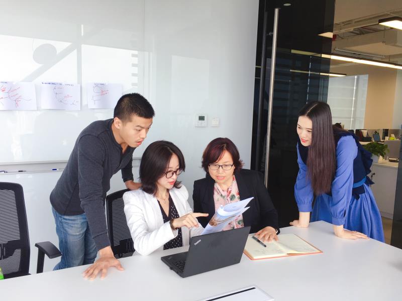 楊春梅和同事一起探討設(shè)計方案修改
