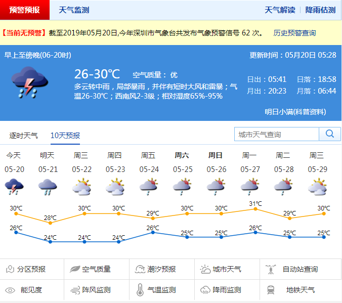 一年一度的“5·20”又來了,深圳近年來5月20日當天局部暴雨以上的降雨的風(fēng)險較高。果然,受冷空氣影響,今天白天全市有降雨,局部地區(qū)降雨量級可達到大雨到暴雨,并伴有雷暴和8級左右短時大風(fēng),天氣較劇烈,雷雨過程恰逢周一上班,市民注意合理安排出行。氣溫在25℃-29℃,高溫暴曬天氣緩解。