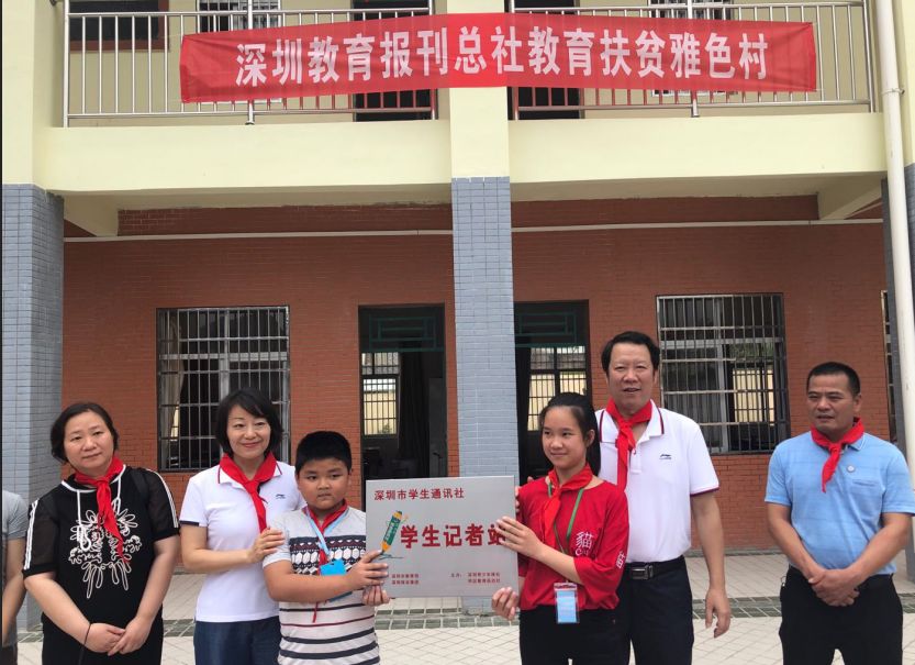 在捐贈儀式上,同學們?yōu)檫h道而來的叔叔阿姨系上了紅領(lǐng)巾,這些“大紅領(lǐng)巾”陪著“小紅領(lǐng)巾”,提前歡慶六一兒童節(jié)的到來??偵邕€為雅色的孩子帶來一份大禮,那就是深圳學通社學生記者站在頌平小學掛牌。
