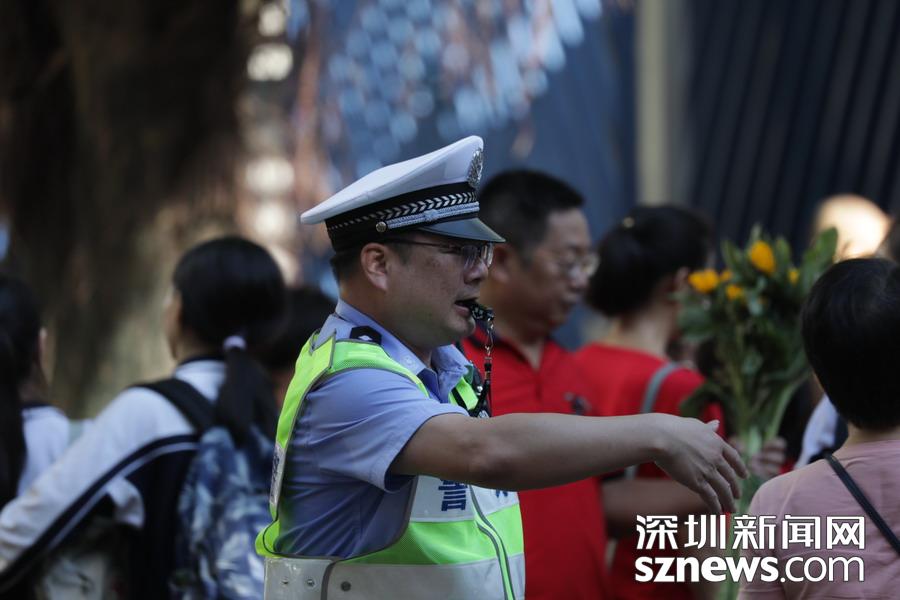 深圳實驗中學考點門口,一名交警正在指揮路面交通