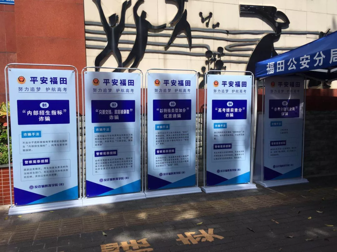 高考結(jié)束后,與高考相關(guān)的一些詐騙也進(jìn)入了活躍高峰期。福田分局制作了高考反詐騙相關(guān)展板,在全區(qū)范圍內(nèi)的6個(gè)考點(diǎn)出入口顯眼處擺放,提醒告誡考生及家長(zhǎng)注意高考相關(guān)詐騙手法。