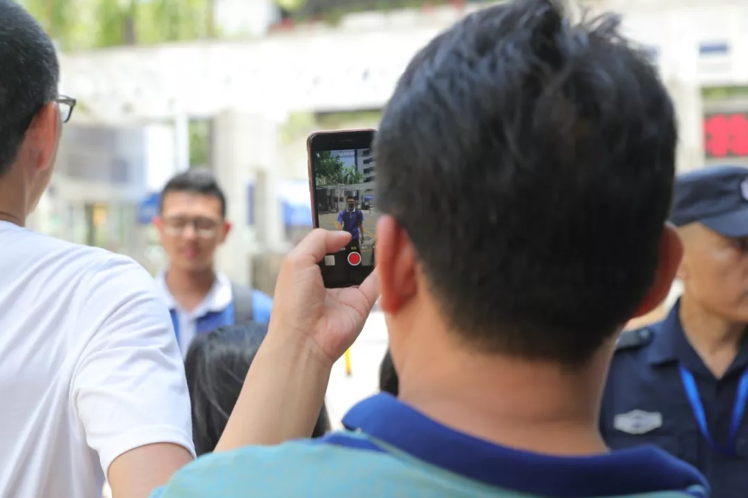 △考場(chǎng)外焦急等待的考生家長(zhǎng)紛紛拿出手機(jī)準(zhǔn)備拍攝邁出考場(chǎng)的孩子。