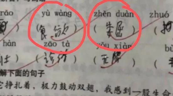 可是仔細(xì)一瞧,卻發(fā)現(xiàn)了蹊蹺。明明題目是讀拼音,寫詞語(yǔ),可是孩子寫的詞語(yǔ)和上面的拼音,完全對(duì)不上號(hào),老師卻依舊打了對(duì)勾。