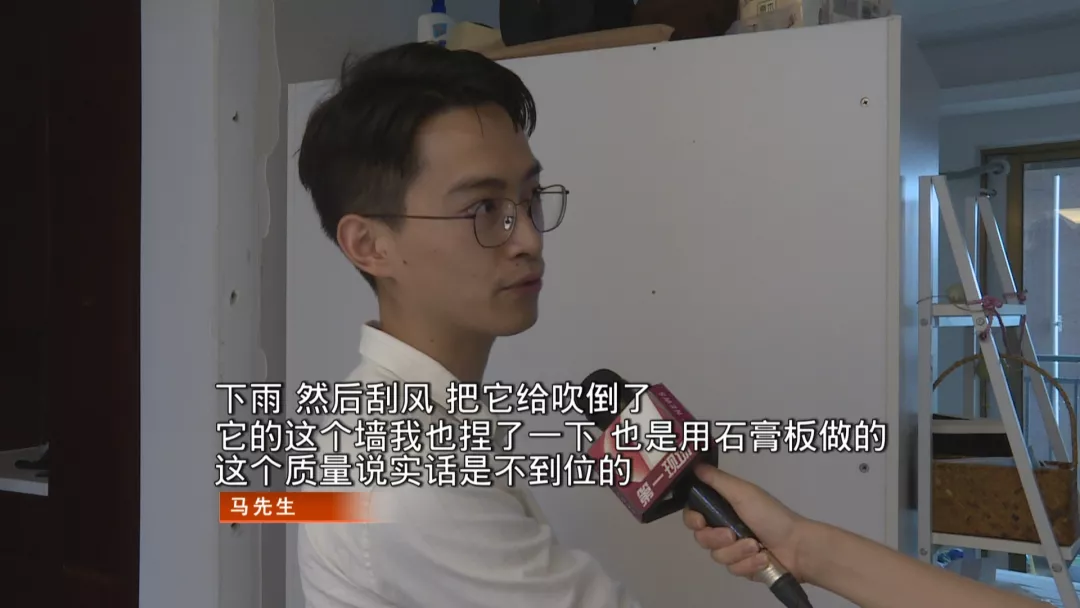 昨天上班的時(shí)候,馬先生沒有關(guān)上陽臺(tái)門,沒料到房間的隔墻竟然被大風(fēng)直接給吹翻了。