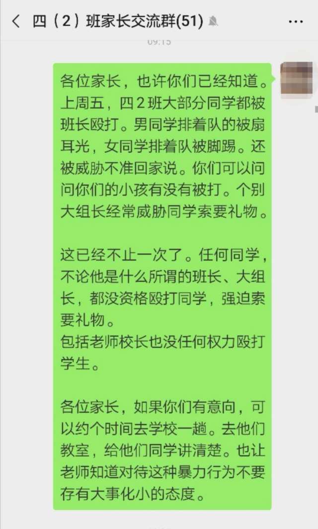 據(jù)女兒反映,當(dāng)天上午課間時分,班長(女)將班上的學(xué)生集合在一起,以違反紀(jì)律為由要體罰他們?!叭嗝麑W(xué)生排著隊被班長毆打,男生被扇耳光,女生被腳踢。”