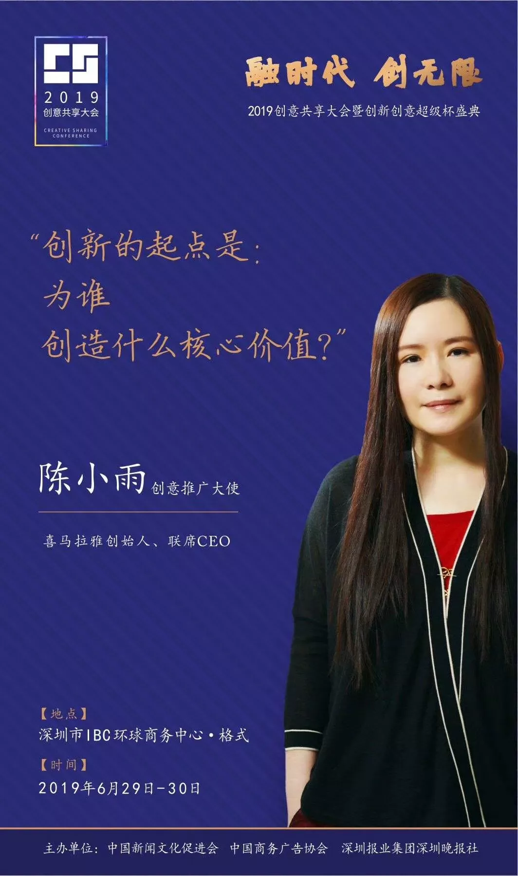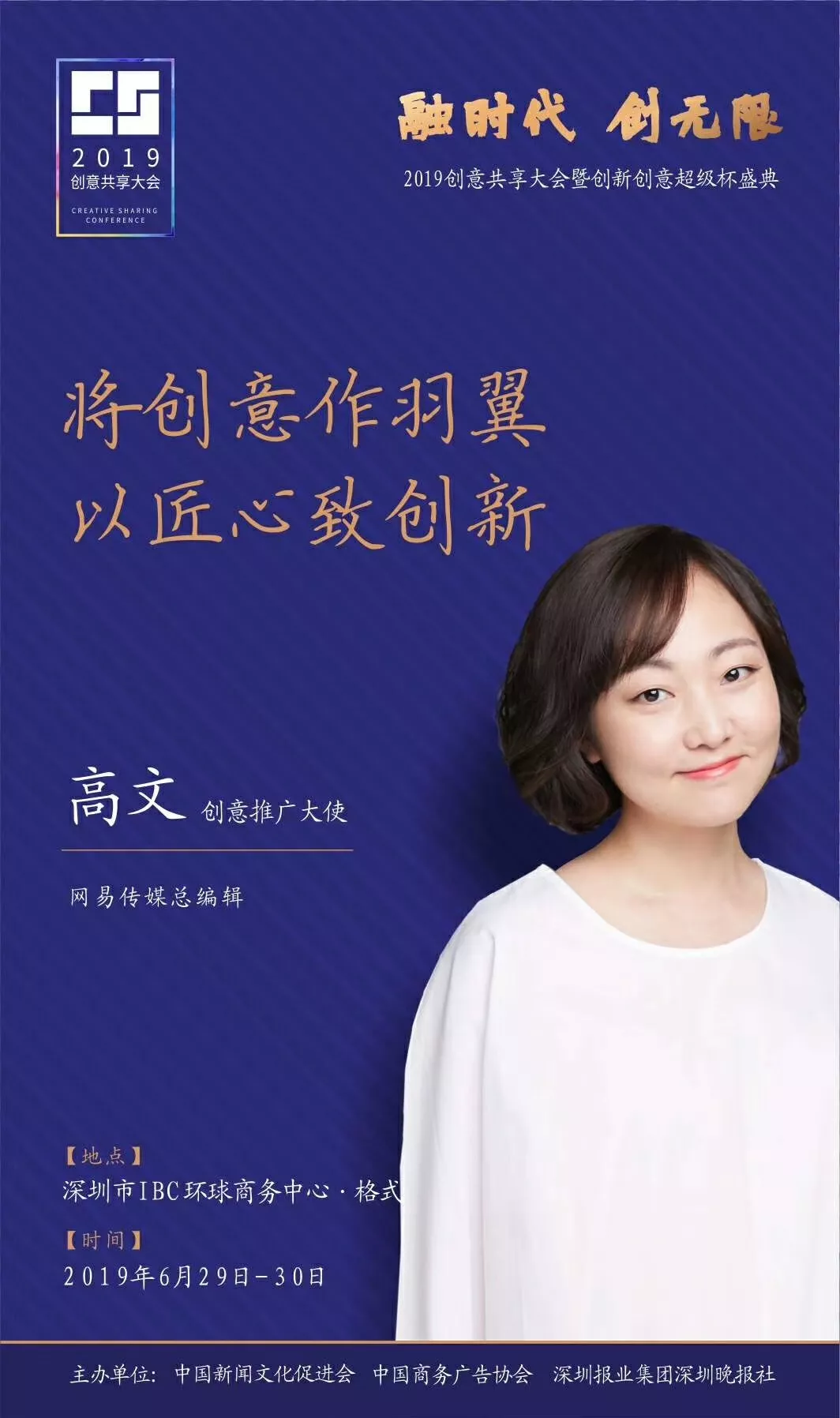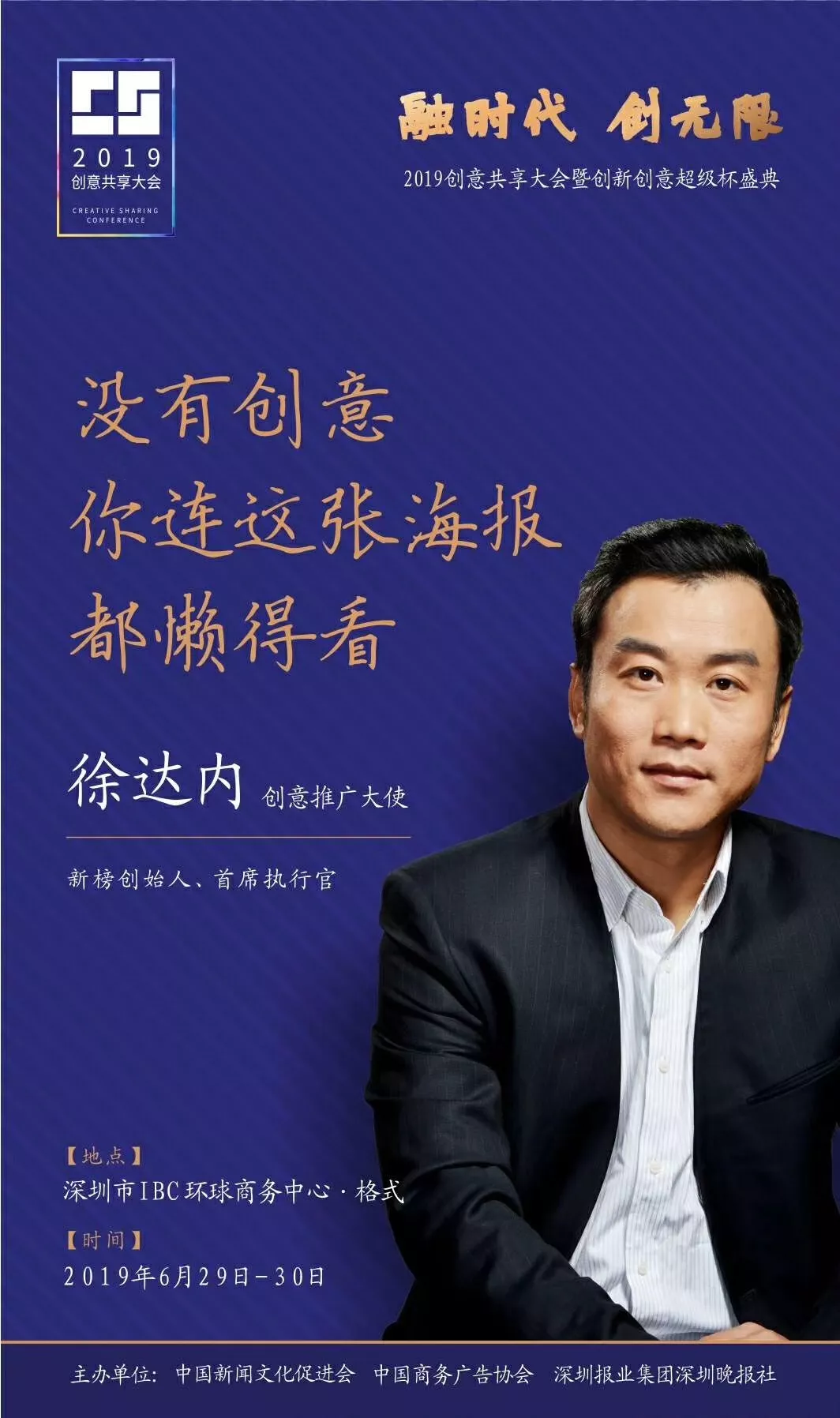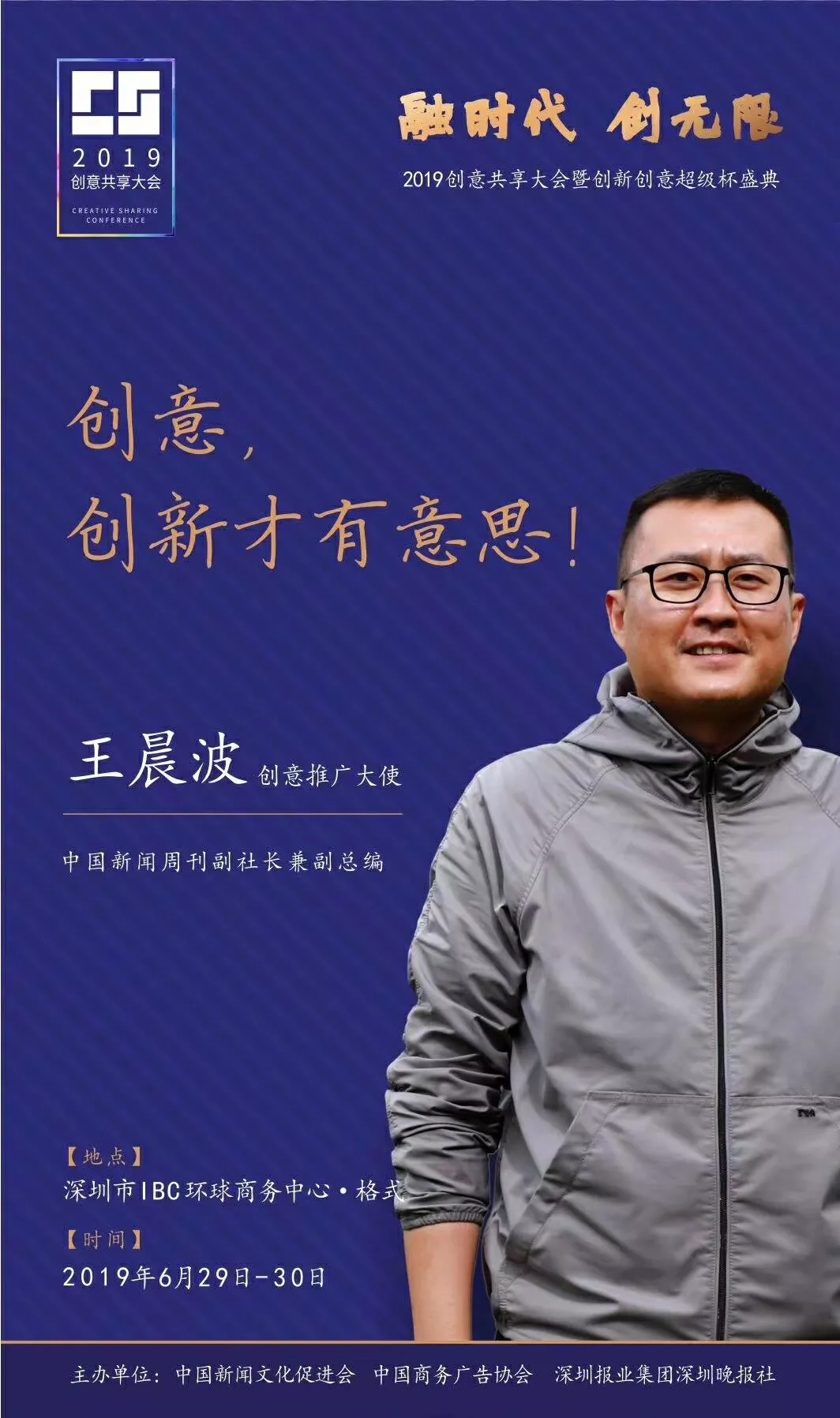 為了展現(xiàn)創(chuàng)意中國的精神風(fēng)貌和創(chuàng)意傳媒的文化力量,構(gòu)建創(chuàng)新創(chuàng)意共同體,擘畫美好圖景和未來趨勢,2019年6月29日至30日,由中國新聞文化促進(jìn)會、中國商務(wù)廣告協(xié)會、深圳報業(yè)集團(tuán)深圳晚報社等聯(lián)合主辦的“融時代創(chuàng)無限——2019創(chuàng)意共享大會暨創(chuàng)新創(chuàng)意超級杯盛典”將在深圳市IBC環(huán)球商務(wù)中心隆重舉辦。