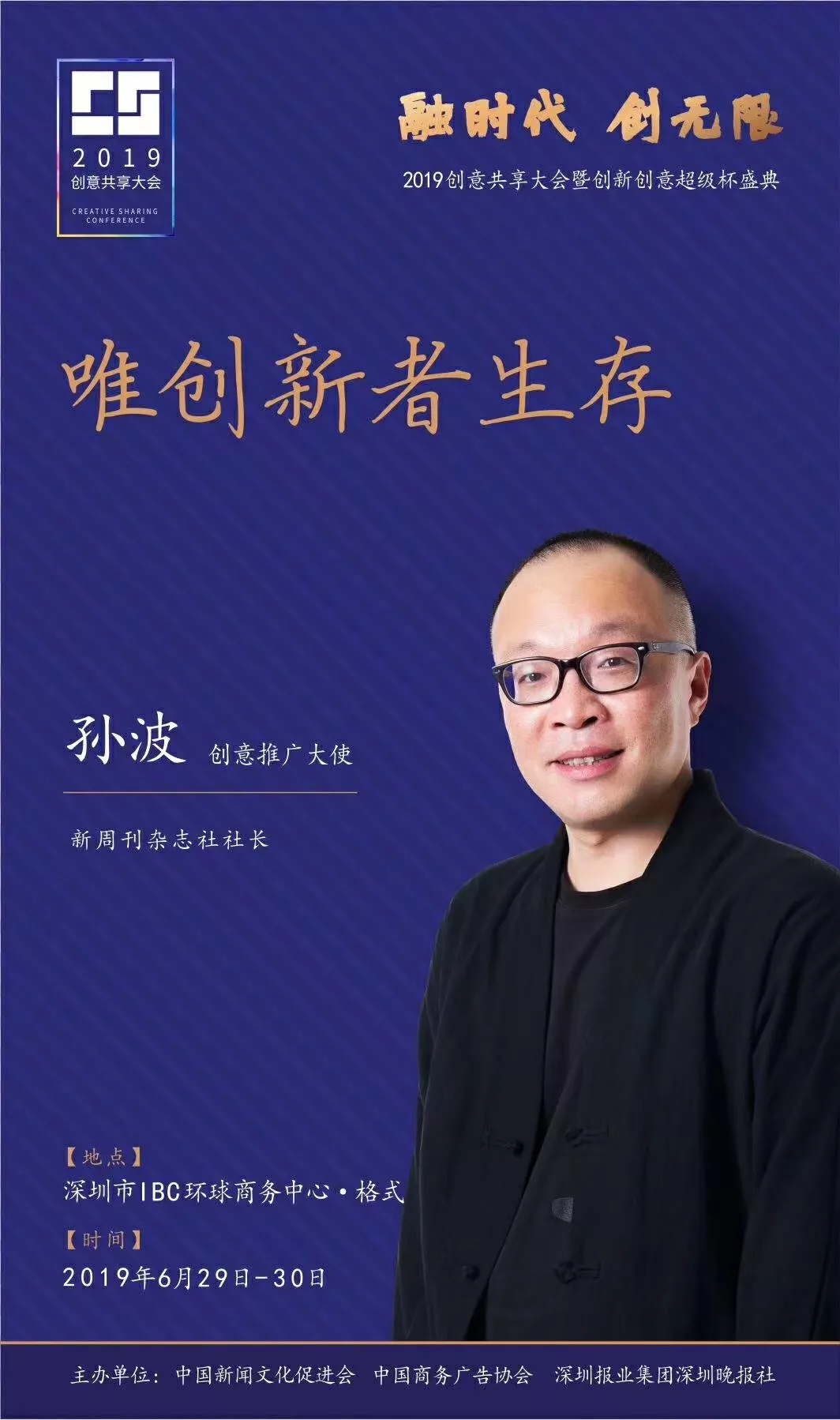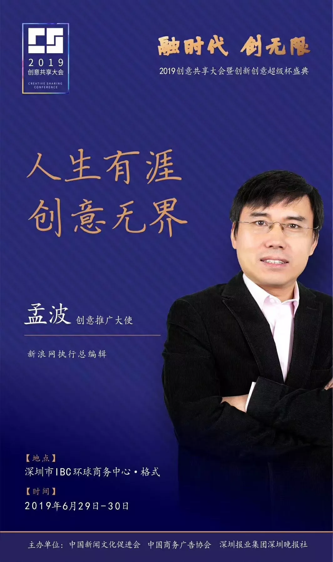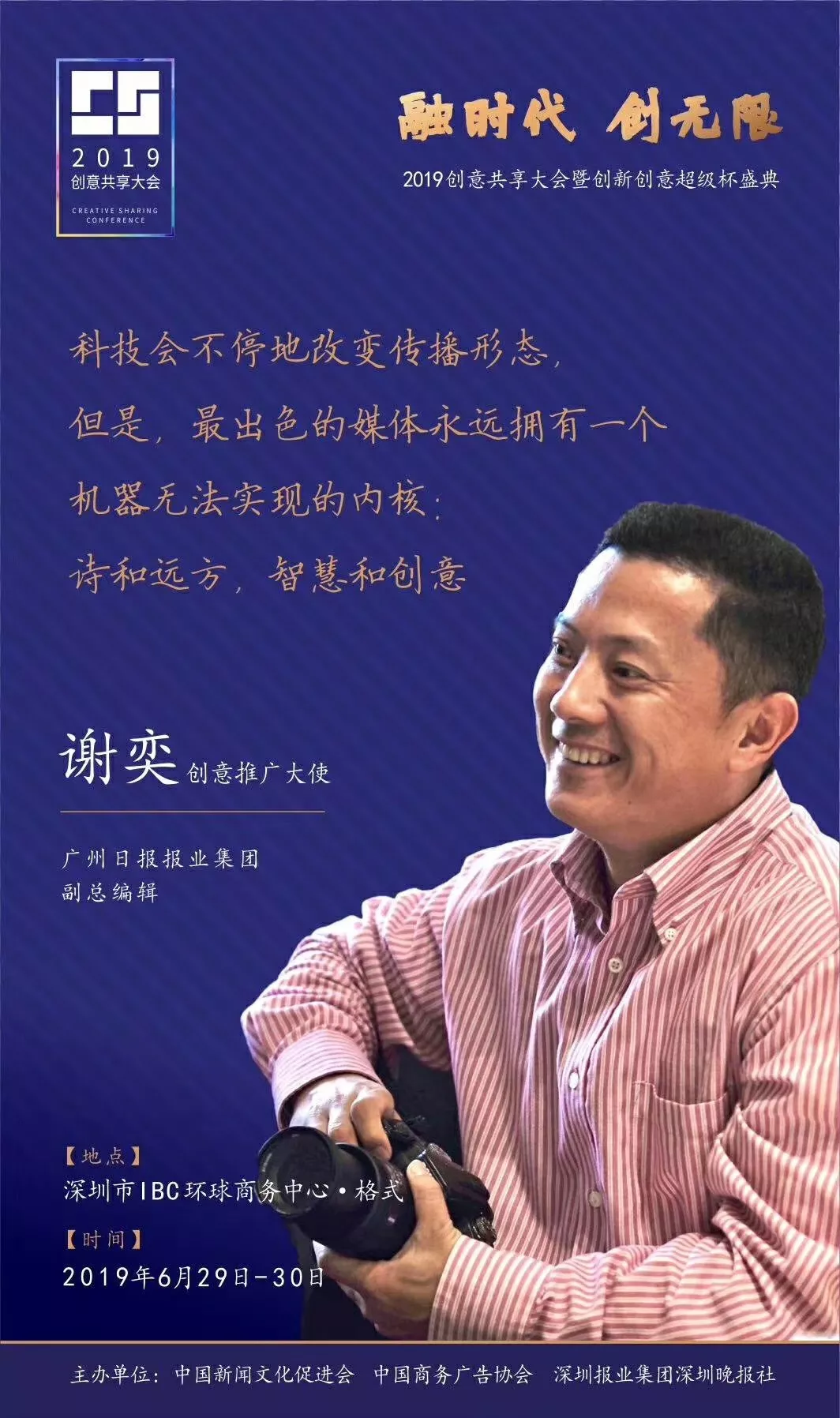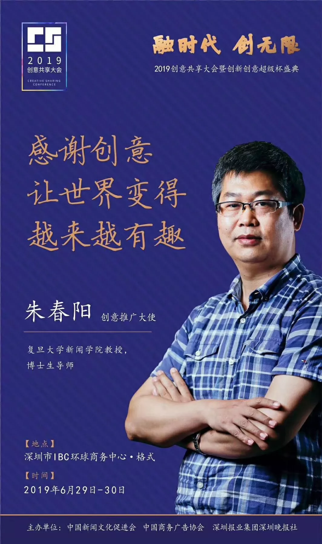 為了展現(xiàn)創(chuàng)意中國的精神風(fēng)貌和創(chuàng)意傳媒的文化力量,構(gòu)建創(chuàng)新創(chuàng)意共同體,擘畫美好圖景和未來趨勢,2019年6月29日至30日,由中國新聞文化促進(jìn)會、中國商務(wù)廣告協(xié)會、深圳報業(yè)集團(tuán)深圳晚報社等聯(lián)合主辦的“融時代創(chuàng)無限——2019創(chuàng)意共享大會暨創(chuàng)新創(chuàng)意超級杯盛典”將在深圳市IBC環(huán)球商務(wù)中心隆重舉辦。