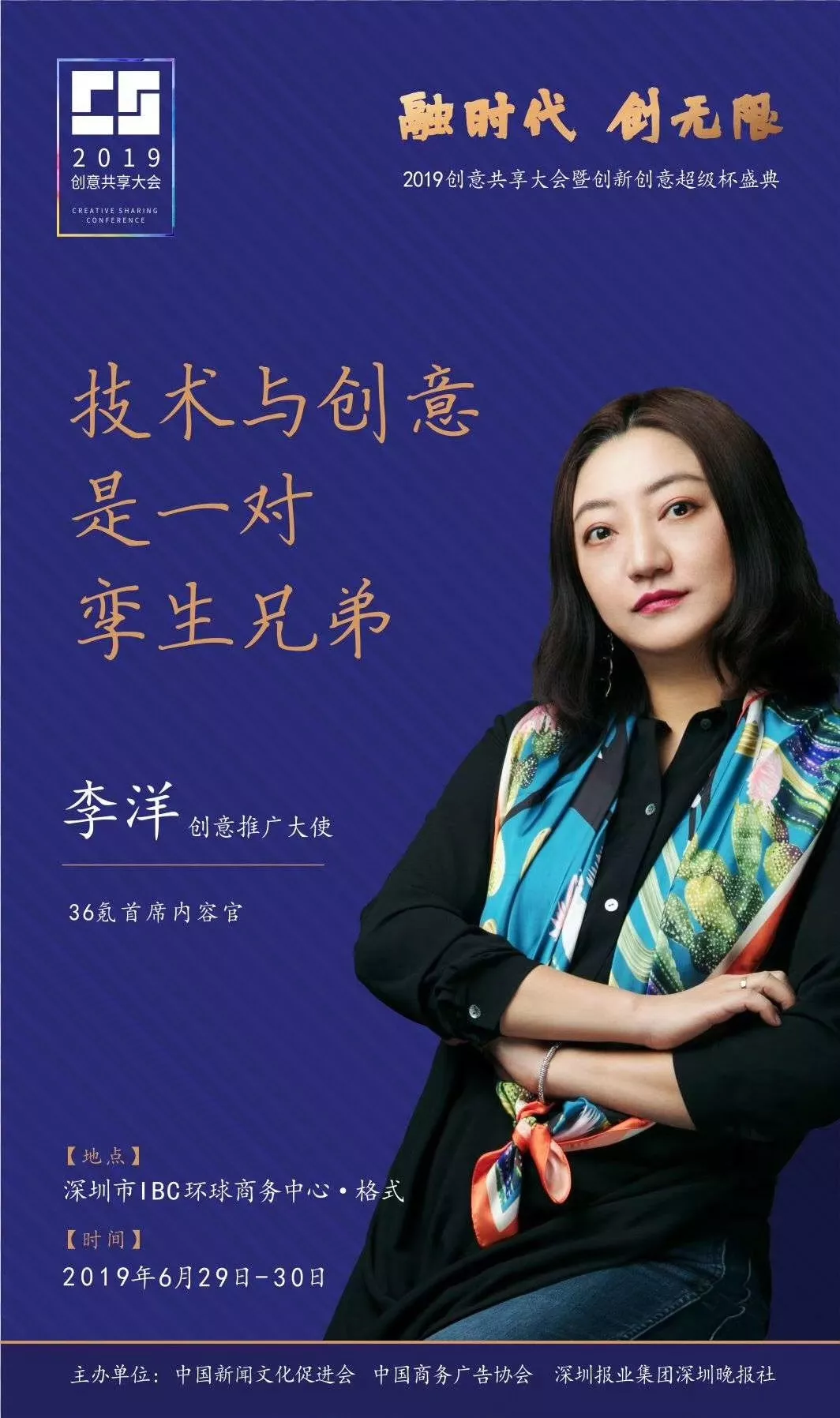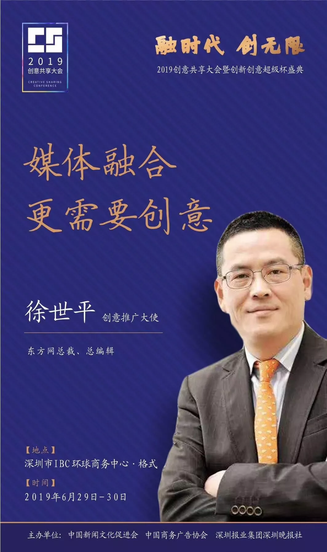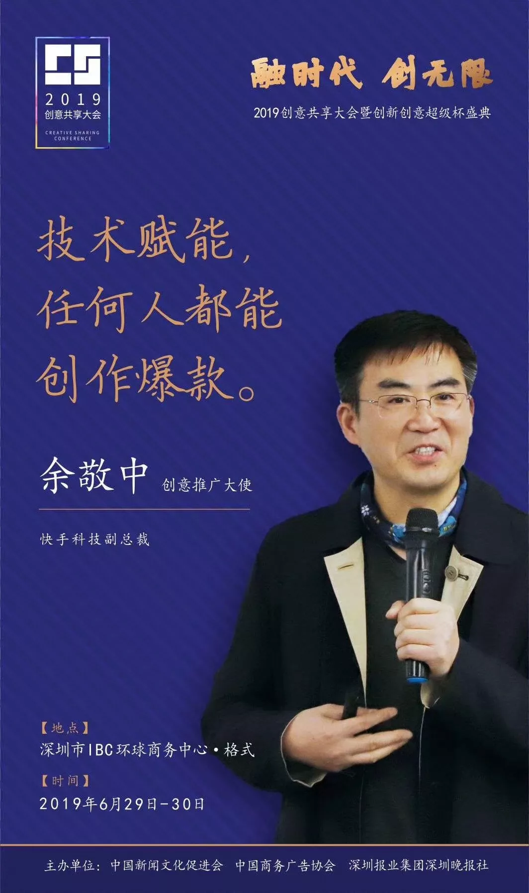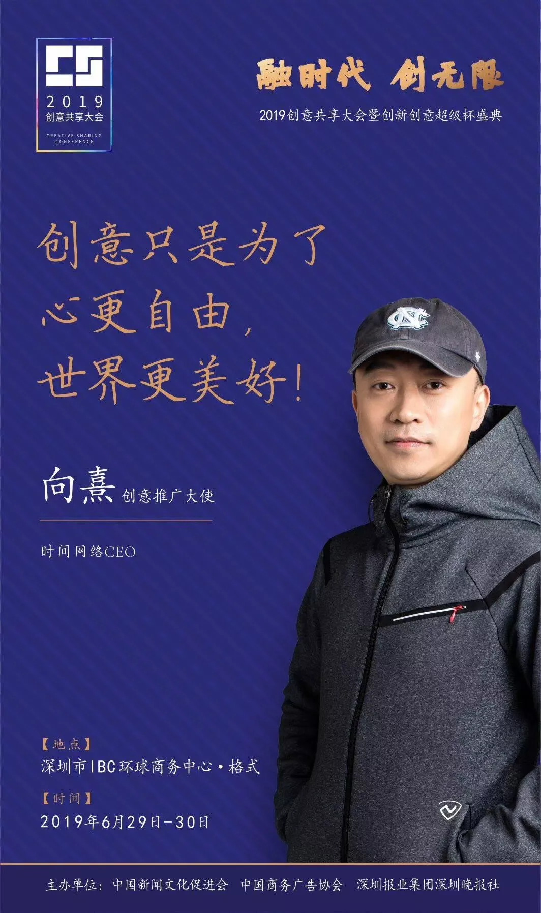 為了展現(xiàn)創(chuàng)意中國的精神風(fēng)貌和創(chuàng)意傳媒的文化力量,構(gòu)建創(chuàng)新創(chuàng)意共同體,擘畫美好圖景和未來趨勢,2019年6月29日至30日,由中國新聞文化促進(jìn)會、中國商務(wù)廣告協(xié)會、深圳報業(yè)集團(tuán)深圳晚報社等聯(lián)合主辦的“融時代創(chuàng)無限——2019創(chuàng)意共享大會暨創(chuàng)新創(chuàng)意超級杯盛典”將在深圳市IBC環(huán)球商務(wù)中心隆重舉辦。