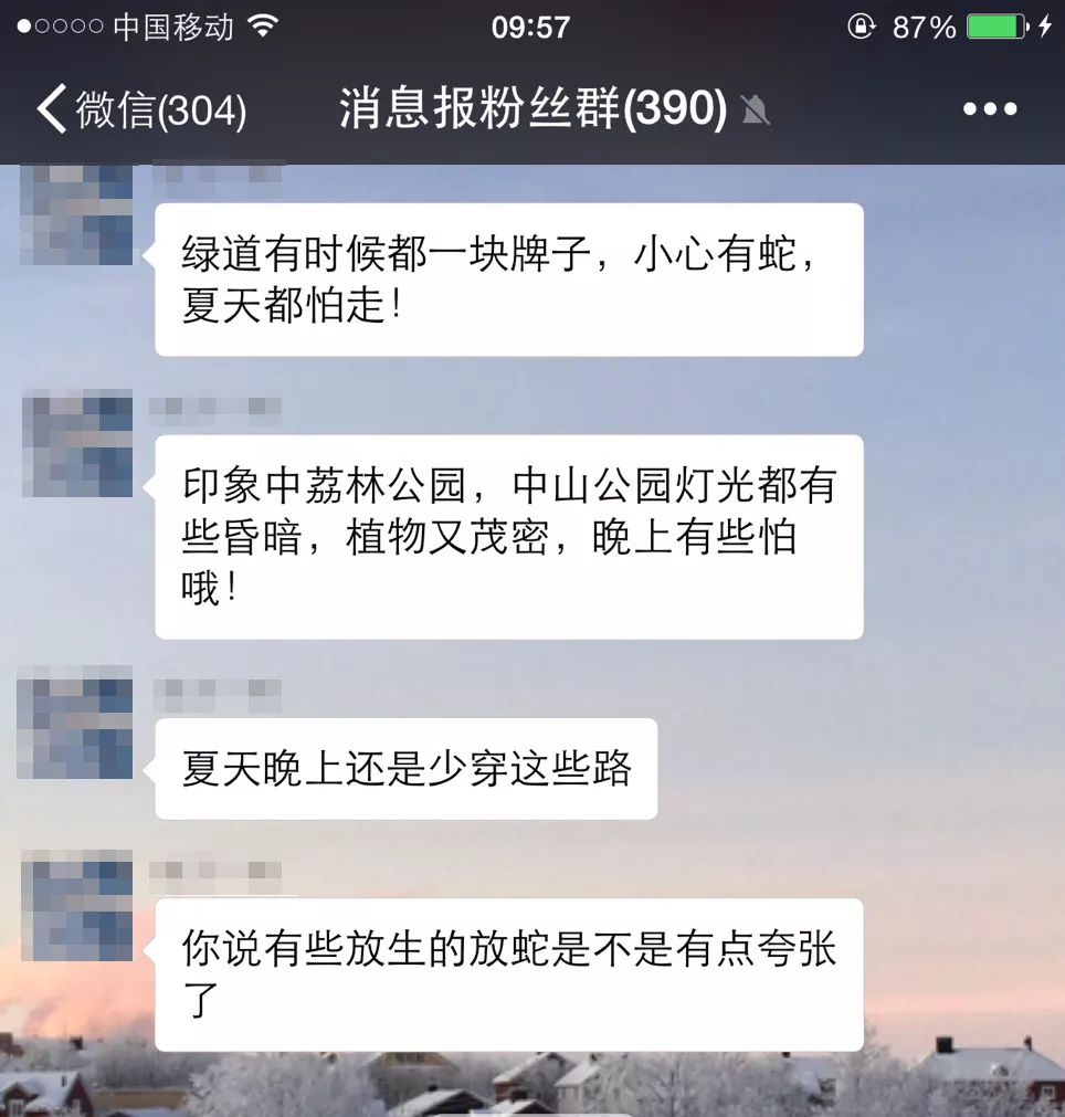 荔林公園蛇出沒的消息,在蛇口消息報微信粉絲群里炸開了鍋,有網(wǎng)友表示,此現(xiàn)象甚是危險,希望能加強管理。