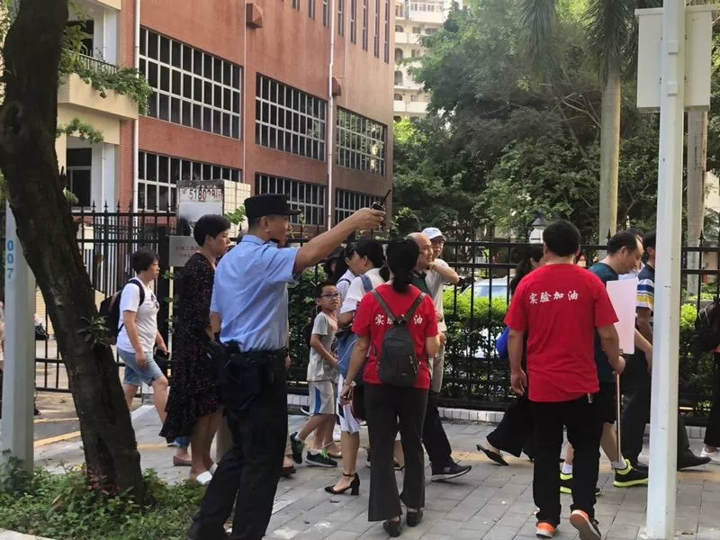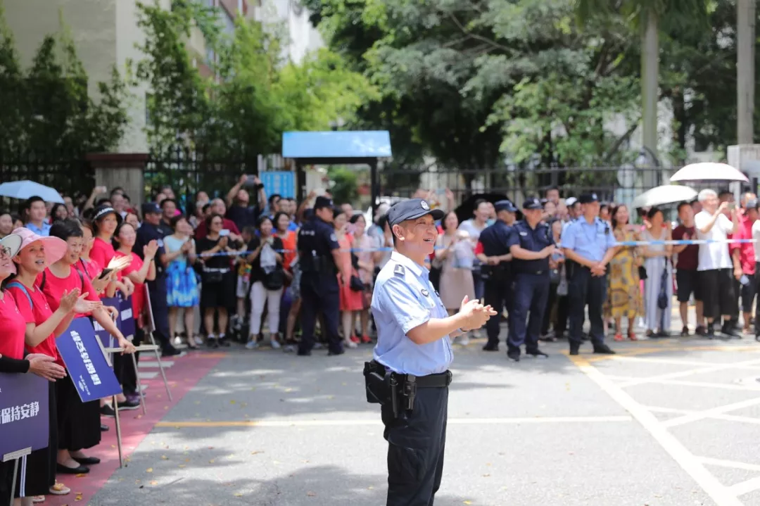 在深圳實驗中學(xué)的校門外,正在執(zhí)勤護考的通心嶺派出所所長林志強正跟送考的家長們“嘮嗑”?!按蠹叶颊具@么久了,辛苦了!一會考試結(jié)束后,咱們來猜一猜第一個走出來的是男生還是女生?!薄拔也率悄猩??!薄拔也率桥!奔议L們一掃臉上焦急的表情,開始笑著討論起來。