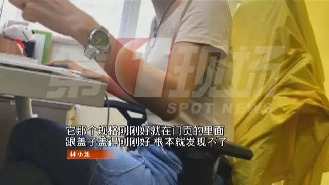 ↑廁所門與擋板由合頁連接,而針孔攝像頭則剛好暗藏于廁所門最下面的合頁內(nèi)。如果不仔細(xì)看,很難發(fā)現(xiàn)。