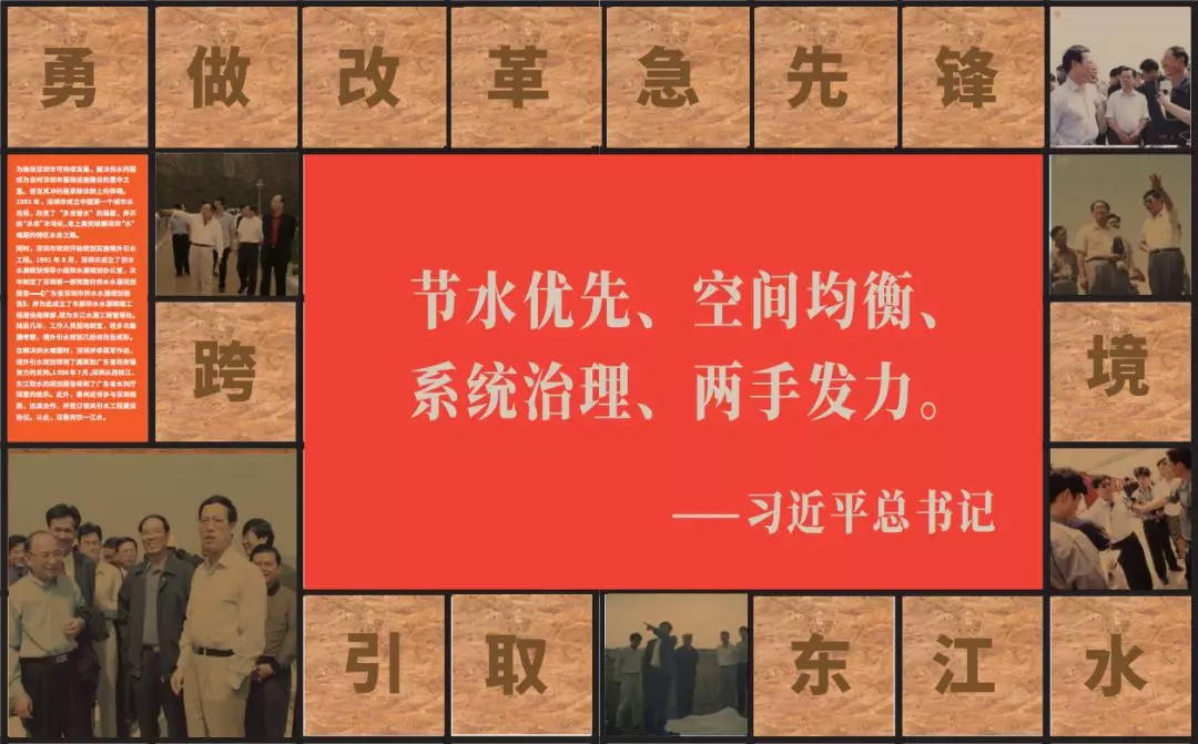 第二部分以“勇做改革急先鋒跨境引取東江水”為題,通過1992年至2004年的東江水源工程規(guī)劃報告及規(guī)劃圖、踏勘團隊的工作影像等歷史資料,體現(xiàn)深惠兩地領(lǐng)導(dǎo)對工程的重視和工程規(guī)劃的前瞻性。