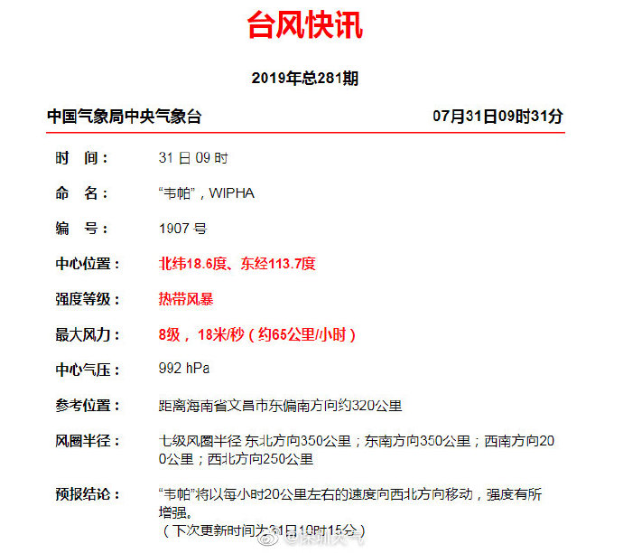 氣象部門預(yù)計,未來24小時內(nèi)“韋帕”將以每小時15公里-20公里的速度向西北方向移動,強度略有加強,將于8月1日早晨到上午,在茂名電白到海南瓊海一帶沿海地區(qū)登陸,正面襲擊雷州半島。登陸后將穿過雷州半島,移入北部灣。