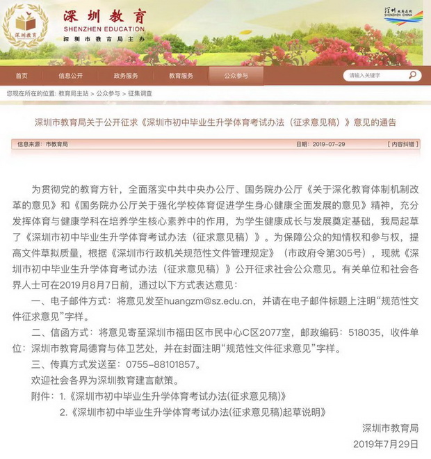 見圳客戶端·深圳新聞網(wǎng)2019年7月31日訊(見圳客戶端·深圳新聞網(wǎng)記者 余俐潔)日前,市教育局發(fā)布《深圳市初中畢業(yè)生升學(xué)體育考試辦法(征求意見稿)》(以下簡(jiǎn)稱《考試辦法》)。根據(jù)《考試辦法》中考體育必考科目調(diào)整為中長(zhǎng)跑(男生1000米,女生800米)或100米游泳(不限泳姿)二選一,考試總分由現(xiàn)行的30分調(diào)整為50分,從2019年入學(xué)的初一學(xué)生開始實(shí)施,即到2022年及以后的中考考生適用新方案。征求意見時(shí)間至2019年8月7日。