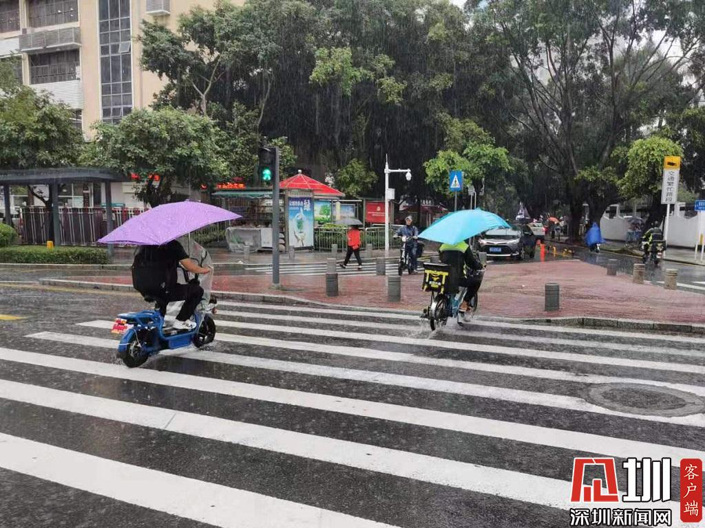 暴雨中騎車出行的“騎士們”。(見圳客戶端、深圳新聞網(wǎng)記者 鄭曉鵬 攝)