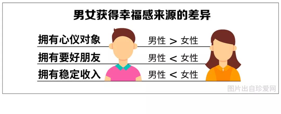 深入研究發(fā)現(xiàn),男性對“擁有心儀對象”的需求比例(6.67%)略高于女性(3.17%),女性則是在擁有要好朋友的比例(28.79%)上高于男性(6.67%),且因為穩(wěn)定收入感到幸福的女性比例(60%)比男性(53%)更高??梢?,女性更容易從穩(wěn)定的收入中獲得幸福感。