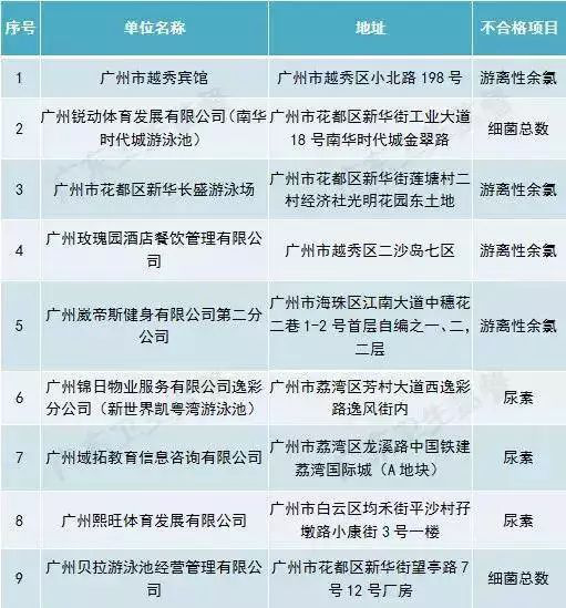 廣東省部分城市游泳場(chǎng)所水質(zhì)抽檢不合格場(chǎng)所名單(第一批)