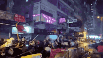 ④25日晚,激進(jìn)示威者在荃灣沙咀道與警方發(fā)生沖突,一度向警員進(jìn)逼,警方后退。危急之下,現(xiàn)場(chǎng)至少有3名警察拔槍?zhuān)F(xiàn)場(chǎng)傳出槍聲。