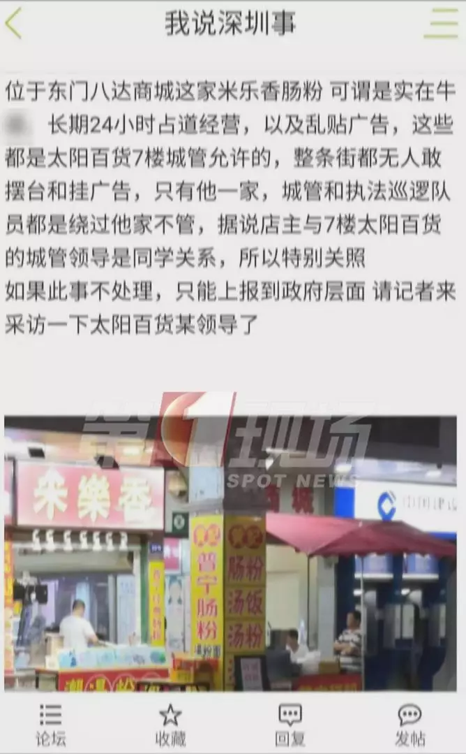 昨天,論壇上的一則帖子引起網(wǎng)友圍觀,帖子提到位于東門八達(dá)商城的米樂腸粉店,24小時(shí)占道經(jīng)營(yíng),亂貼廣告。整條街都不敢這么做,唯獨(dú)這家沒有城管管理,原因是店主跟7樓太陽(yáng)百貨的城管領(lǐng)導(dǎo)是同學(xué)。