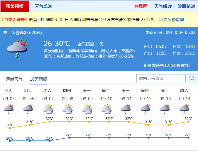 見圳客戶端、深圳新聞網(wǎng)2019年9月5日訊 今年14號(hào)臺(tái)風(fēng)“劍魚”(熱帶風(fēng)暴級(jí))3日17時(shí)減弱為熱帶低壓后,其風(fēng)力進(jìn)一步減弱,已難以確定其環(huán)流中心,中央氣象臺(tái)于4日2時(shí)停止對其編號(hào)。市氣象臺(tái)于4日8時(shí)30分取消臺(tái)風(fēng)白色預(yù)警信號(hào)。盡管如此,受“劍魚”減弱后低壓槽影響,今日我市有大雨局部暴雨,沿海、海區(qū)和高地陣風(fēng)6-7級(jí);6日降雨減弱;7日起轉(zhuǎn)多云,有短時(shí)陣雨,天氣炎熱。