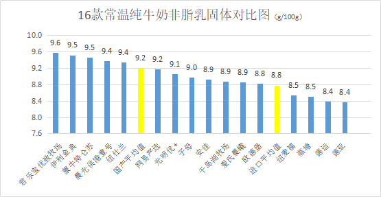 測評結(jié)果顯示:君樂寶優(yōu)質(zhì)牧場、伊利金典、蒙牛特侖蘇非脂乳固體含量排前三,8款國產(chǎn)牛奶非脂乳固體平均值9.2g/100g,8款進口牛奶非脂乳固體平均值8.8g/100g,均高于國標要求,國產(chǎn)牛奶表現(xiàn)優(yōu)于進口牛奶。