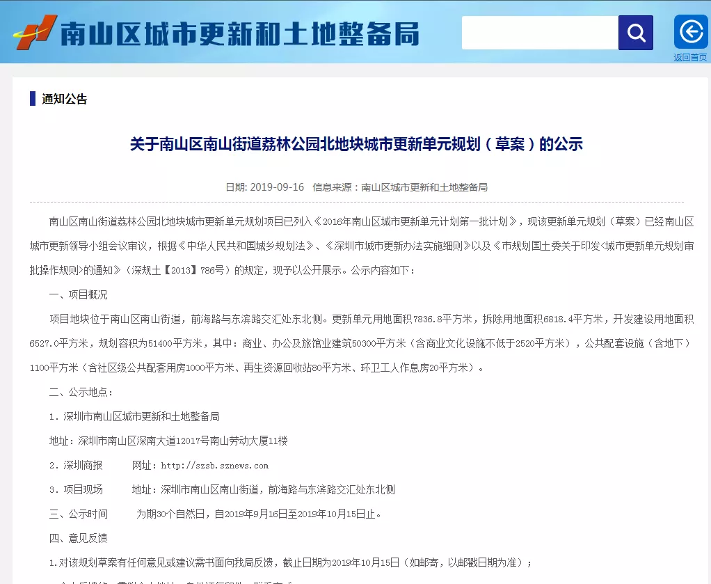▲南山區(qū)城市更新和土地整備局官網(wǎng)截圖
