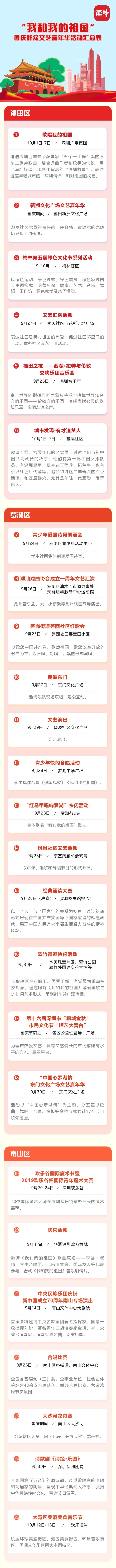 深圳特區(qū)報(bào)2019年9月26日訊 為熱烈慶祝中華人民共和國(guó)成立70周年,深圳市將舉辦規(guī)模盛大的全市性專場(chǎng)音樂會(huì)、群眾文藝晚會(huì)、焰火晚會(huì)等活動(dòng),同時(shí)將在各區(qū)舉辦80場(chǎng)“我和我的祖國(guó)”國(guó)慶群眾文藝嘉年華活動(dòng),并在全市各區(qū)舉行“愛我中華——南粵百園慶國(guó)慶”主題游園。各有關(guān)活動(dòng)安排如下: