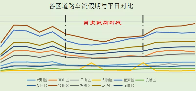 市內(nèi)交通除大鵬和鹽田區(qū)較平日有所上升外,其余各區(qū)均較平日車流減少30%左右。