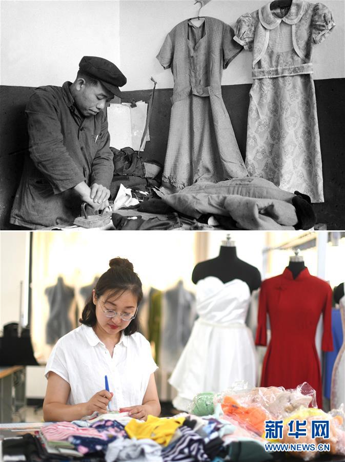 拼版照片:上圖為1957年,天津市縫紉供銷(xiāo)社職工在用舊大褂改制當(dāng)時(shí)女性流行的服裝——“布拉吉”(俄語(yǔ)“連衣裙”的音譯)(新華社記者梁一丁攝);下圖為2019年6月20日,天津工業(yè)大學(xué)針織與針織服裝系教師匡麗赟在學(xué)校教室使用服裝企業(yè)廢棄的舊面料進(jìn)行創(chuàng)作(新華社記者岳月偉攝)。