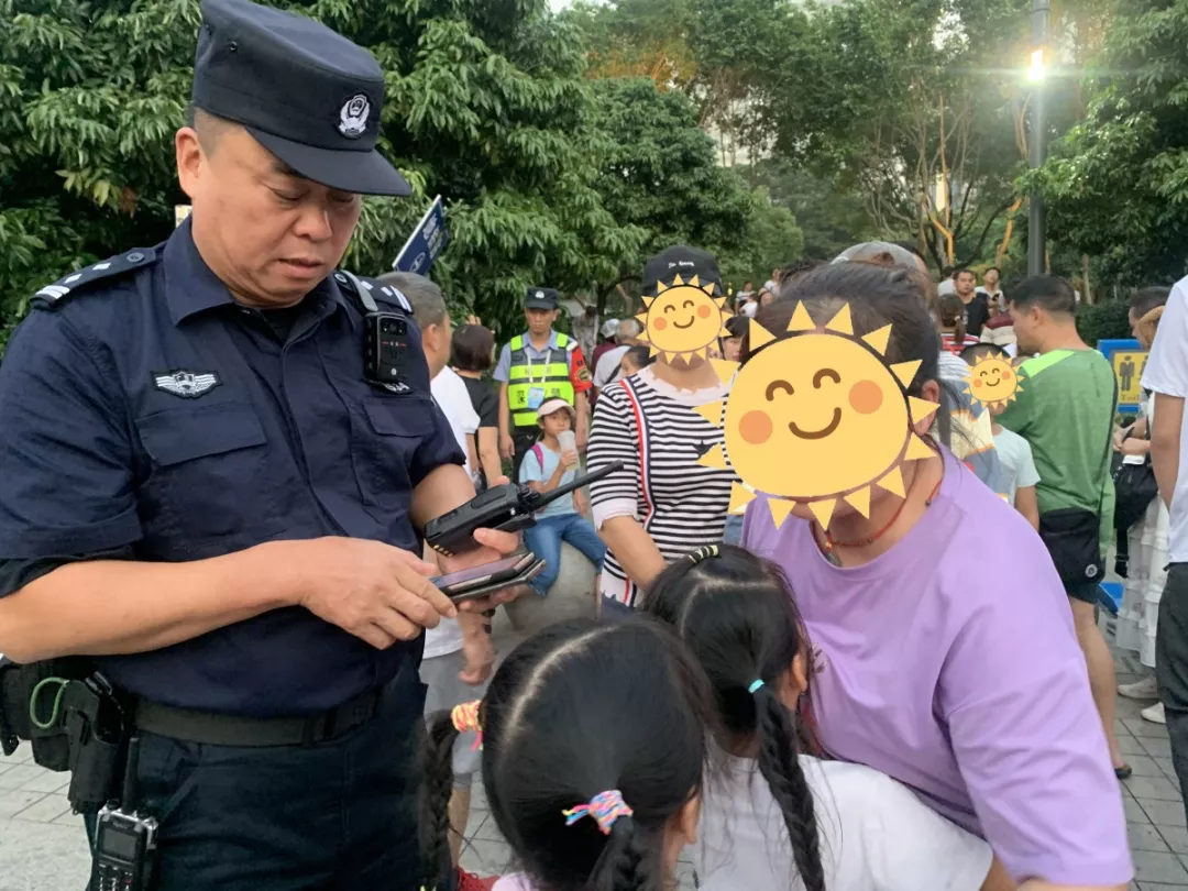 10月2日,深圳市公安局福田公安分局機(jī)動(dòng)訓(xùn)練大隊(duì)五中隊(duì)民警麥炳耀在燈光秀安保執(zhí)勤中,發(fā)現(xiàn)一位走失小孩的母親心急如焚在哭泣,麥炳耀邊安慰她邊向李曉峰副大隊(duì)長、黃鎮(zhèn)雄副大隊(duì)長報(bào)告情況,隨后大隊(duì)領(lǐng)導(dǎo)立即通過對講機(jī)向現(xiàn)場執(zhí)勤民警和隊(duì)員通報(bào)尋人啟事及人物特征,不久后,對講機(jī)傳來好消息,在民警麥炳耀帶領(lǐng)輔警張世鵬尋尋找下,終于在東廣場東北出入口處找到走失的兩個(gè)小孩并迅速通知小孩母親前來帶回。