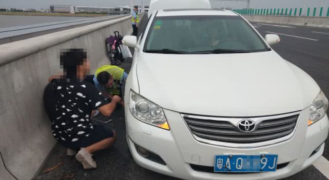 10月5日下午4點多,珠海交警郭警官開著警車在珠三角環(huán)線高速巡邏時,看到有一輛粵AQ××9J號白色豐田小車??吭趹?yīng)急車道上,打著雙閃。郭警官立即上前詢問情況,原來小車剛上高速沒多久就爆胎了,司機深知在高速停下來很危險,急得團團轉(zhuǎn),天還下起了小雨。