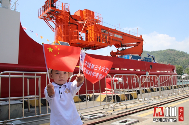 小朋友在“雪龍2”號前揮舞國旗。