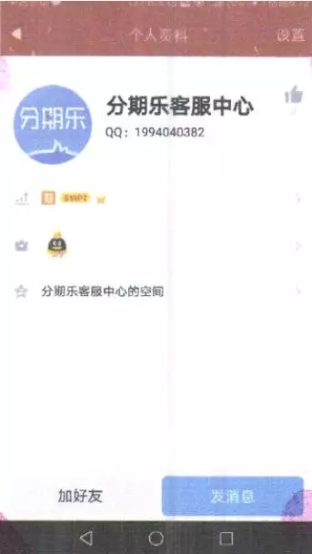 各種信息都對(duì)的上,陳林隨即添加了對(duì)方的QQ(昵稱:分期樂客服中心)。