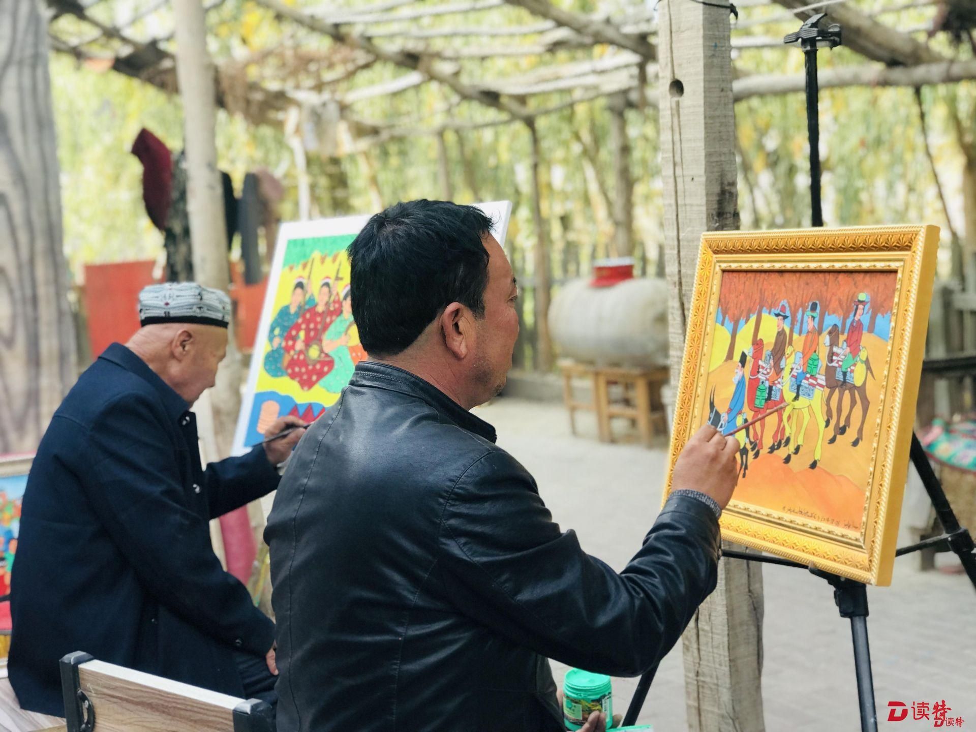 國家級(jí)農(nóng)民畫畫家木卡熱埔江·艾海提告訴記者記者,他現(xiàn)在一年有將近45000元的收入,一部分來自于在安居房上畫農(nóng)民畫,一年有30000塊錢的收入,另一部分是自己賣出的畫,一年能掙15000?!艾F(xiàn)在麥蓋提旅游的人多了,看到他們喜歡我的畫,我感到很高興,現(xiàn)在越畫越有勁了!”聊起麥蓋提的發(fā)展,木卡熱埔江的臉上難掩喜悅。