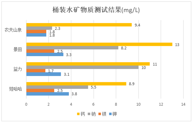3款飲用天然礦泉水和1款飲用天然水中的礦物質鉀、鈣、鈉、鎂是人體所需元素,均符合國家標準及產品標簽明示指標的要求,分別是農夫山泉、景田、益力和娃哈哈。