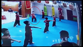 ▲監(jiān)控畫面顯示,男教練員拿起長棍,直接扔向小劉,棍子擊中孩子頭部