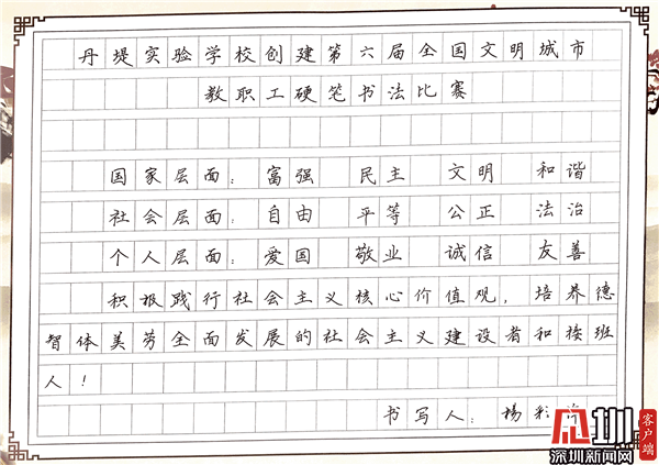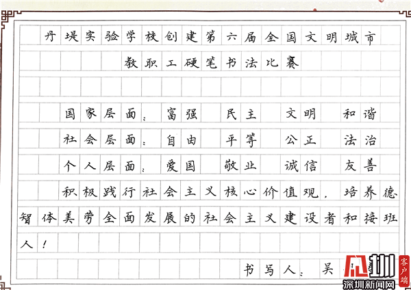 見圳客戶端·深圳新聞網(wǎng)10月29日訊(見圳客戶端、深圳新聞網(wǎng)記者 潘寶儀 通訊員 袁小俊 圖/朱雅琪 ) 為落實立德樹人總目標、培育和踐行社會主義核心價值觀,創(chuàng)建文明城市,積極倡導全校教職工勤練教學基本功,提高教師綜合素養(yǎng),豐富課余生活,展示丹堤實驗學校教職工風采,學校于10月25日舉行了“創(chuàng)建第六屆全國文明城市教職工硬筆書法比賽”。